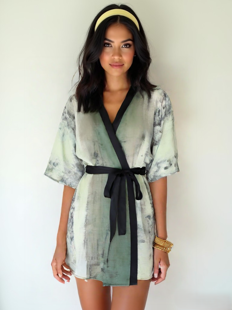 • A bamboo fabric band and matching tie finishes your printed kimono in your choice of black, cream, or dark grey.